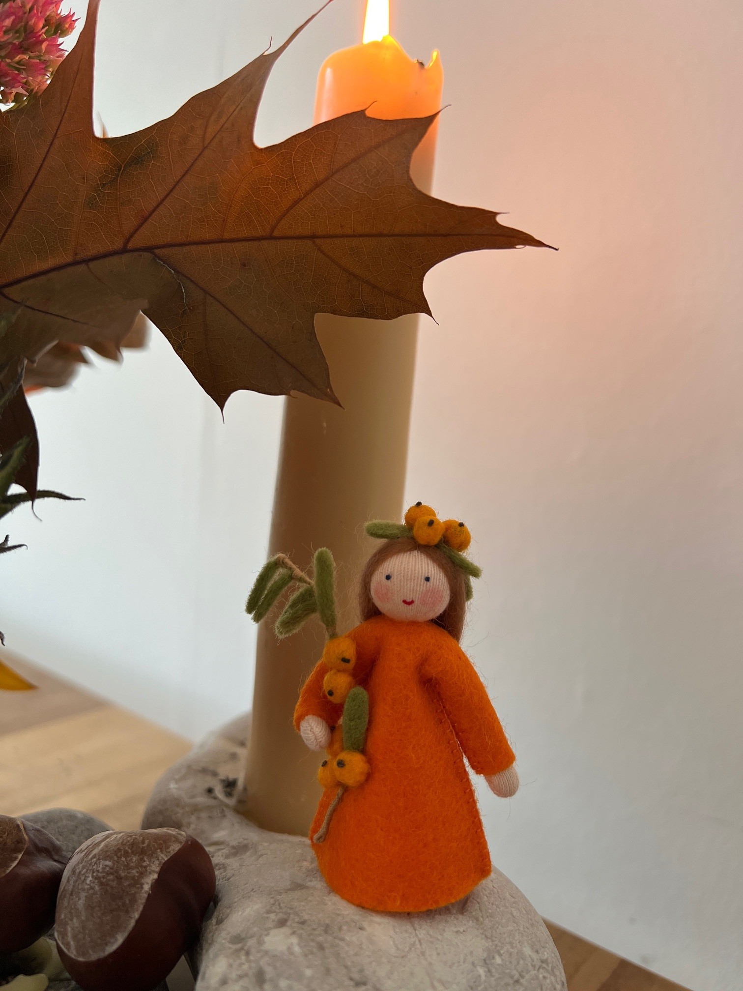 Sorgfältig von Hand aus hochwertigem Wollfilz gefertigt, trägt das kleine Wesen ein leuchtend orangefarbenes Kleid und hält eine filigrane Sanddornzweig-Nachbildung mit zarten Filzkügelchen in der Hand.