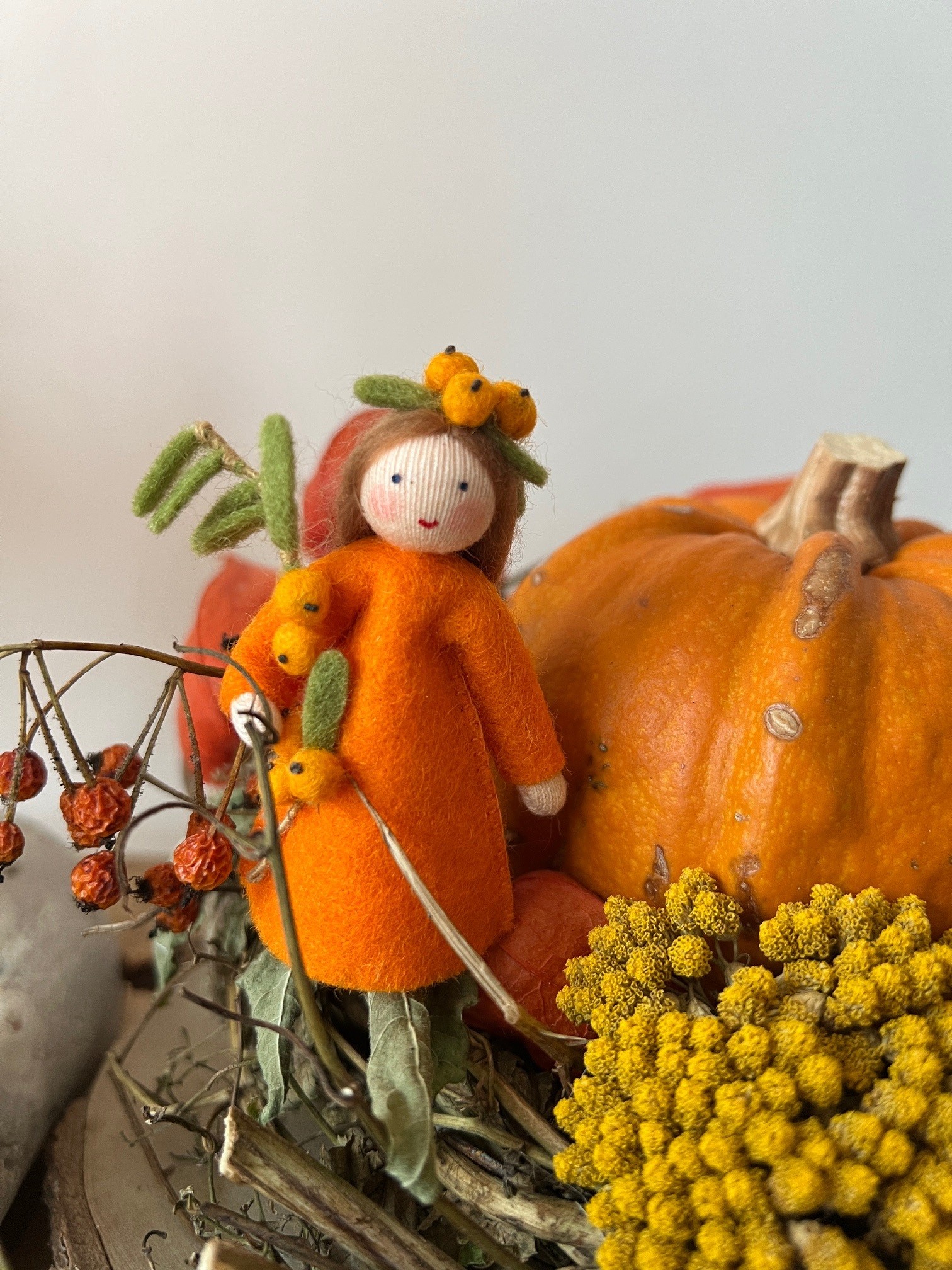 Dieses liebevoll gestaltete Blumenkind Sanddorn bringt die warmen Farben des Herbstes auf deinen Jahreszeitentisch.