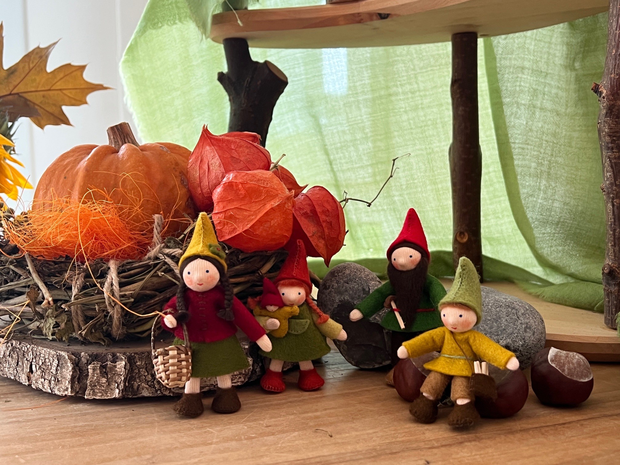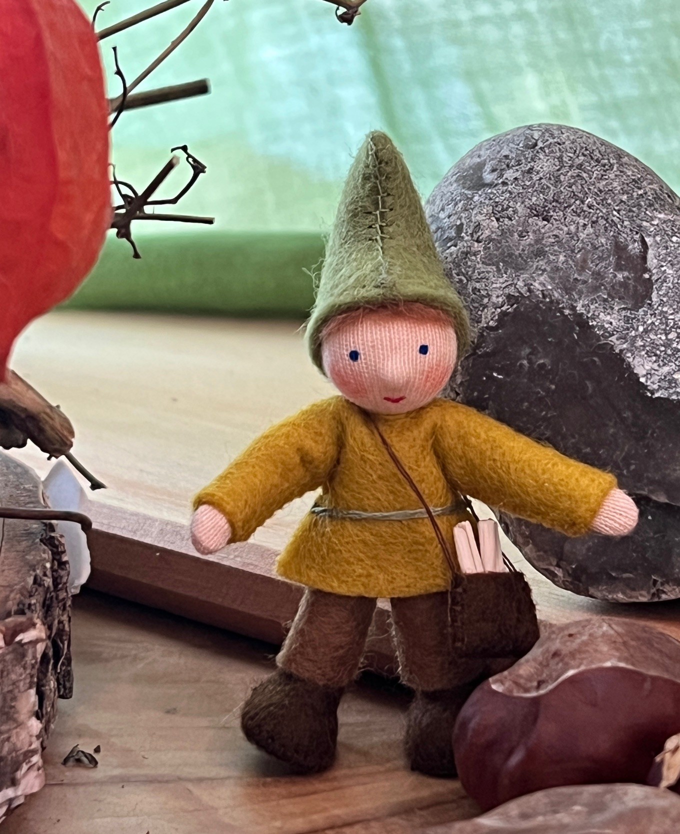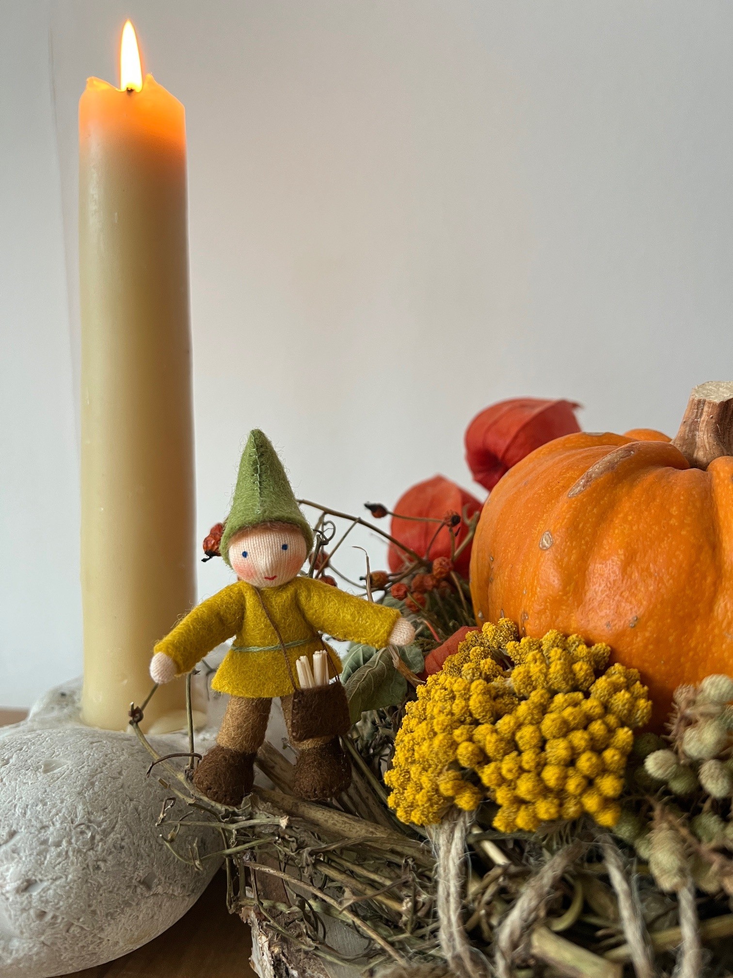 Der fröhliche Zwergenjunge ist stets unterwegs, um kleine Schätze aus dem Wald zu sammeln. Mit seiner grünen Mütze, dem gelben Pullover und der braunen Hose fügt er sich wunderbar in die herbstlichen Farben des Jahreszeitentisches ein.
