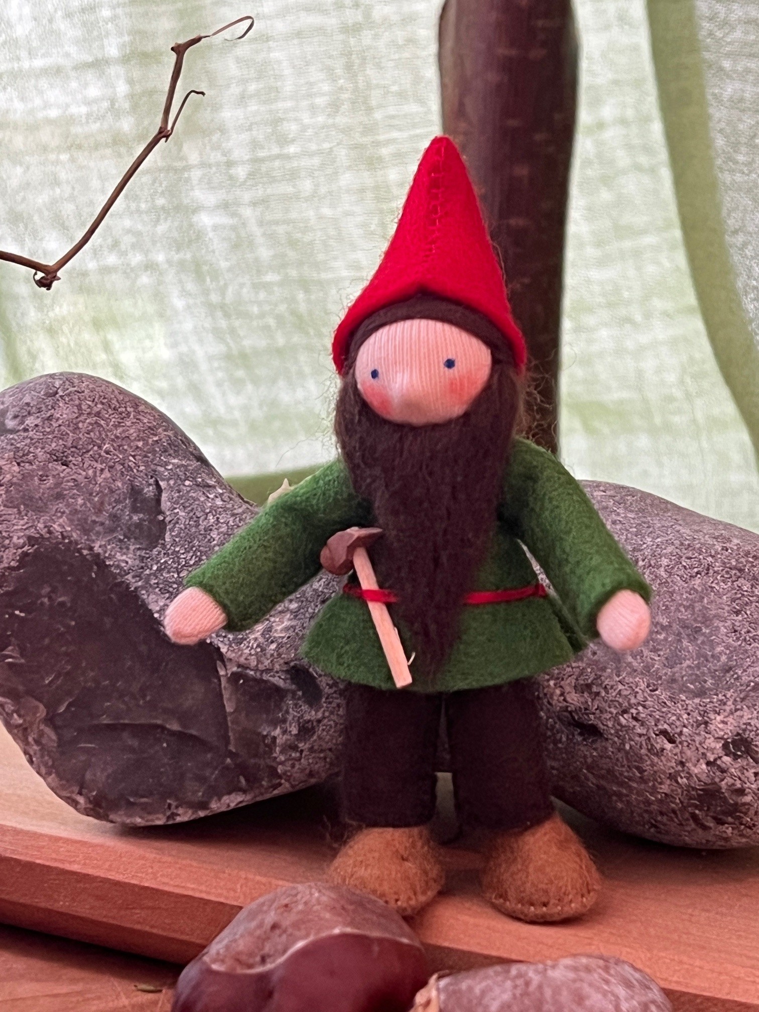 Sorgfältig von Hand aus reinem Wollfilz gefertigt, trägt er stolz seinen kleinen Hammer am Gürtel – stets bereit, im Zwergenreich zu werkeln.