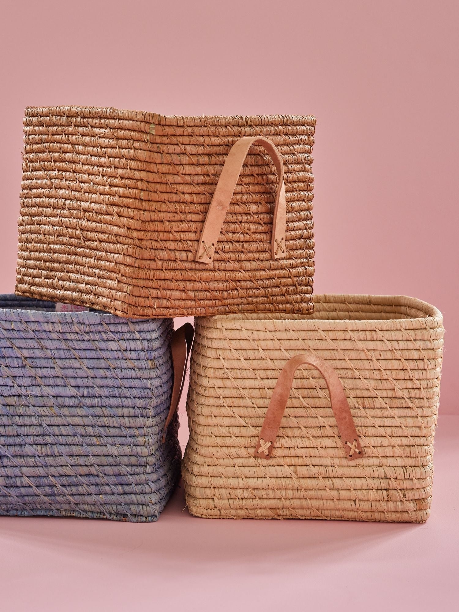 Diese schönen, quadratischen Körbe bieten viel Stauraum für allerlei Spielzeug, Klamotten, Bücher, oder, oder und darüber hinaus machen sie sich sehr gut in jedem Regal. Kinder lieben sie, denn so ist immer schnell aufgeräumt und das Spielzeug von einem Ort zum anderen transportiert. Material: Raffiapalmenbast. Mit Ledergriffen. Maße ca.: H: 25 cm x B: 30 cm x T: 30 cm. In drei verschiedenen Farben zur noch besseren Sortiermöglichkeit.