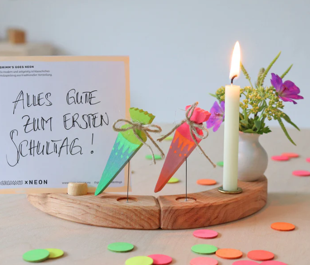 Passend dazu gibt es diese liebevoll gestaltete Steckfigur Schultüte, die den Festtagsring oder die Festtagsspirale auf besondere Weise schmückt. Die beiden Farbvarianten Neonpink und Neongrün begeistern mit zarten Farbverläufen, knalligen Highlights und wunderschönen Details.