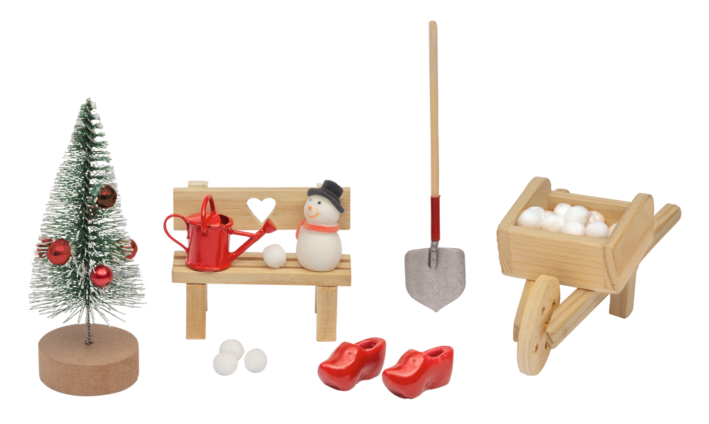 - Das Set besteht aus: Bank, Tannenbaum, Schubkarre, Schaufel, Schuhe, Schneemann, Schneekugeln