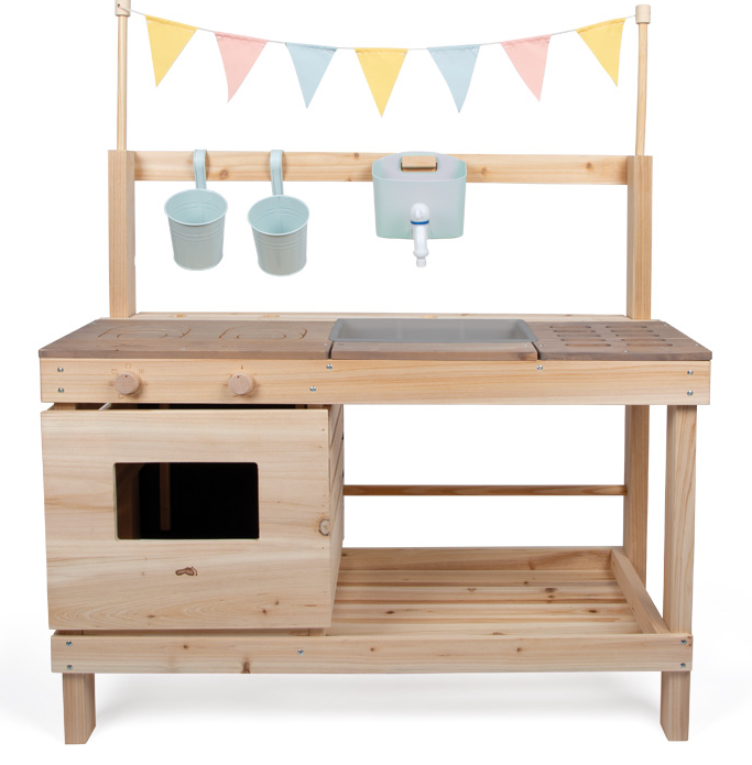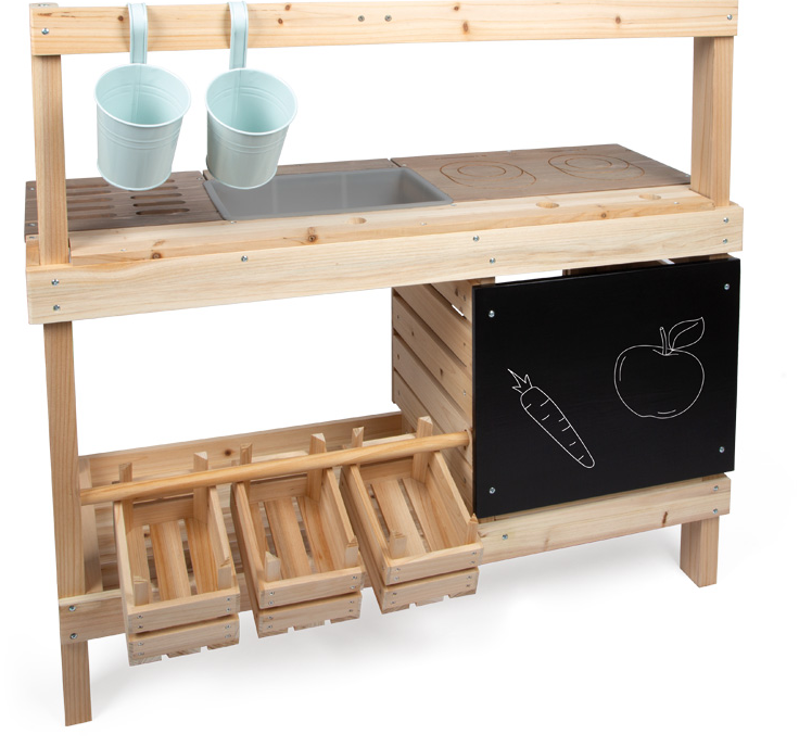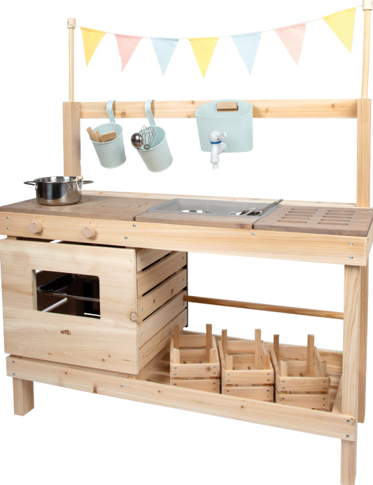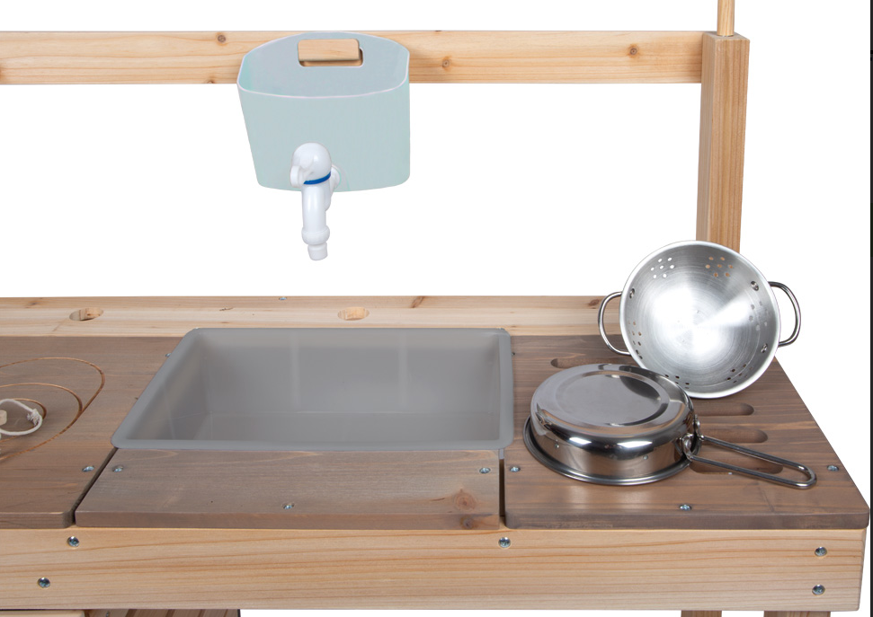 Für noch mehr Spielwert sorgen das umfangreiche Zubehör wie Metall-Kochgeschirr, Küchenhelfer, Hängetöpfe und drei Holzkisten. Eine dekorative Wimpelkette macht die Spielküche zudem zu einem echten Hingucker im Garten. Eine beschreibbare Tafel, seitliche Haken sowie eine farblich abgesetzte Arbeitsplatte runden die durchdachte Ausstattung perfekt ab.